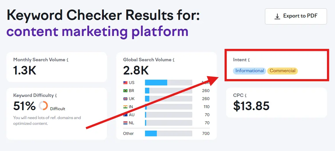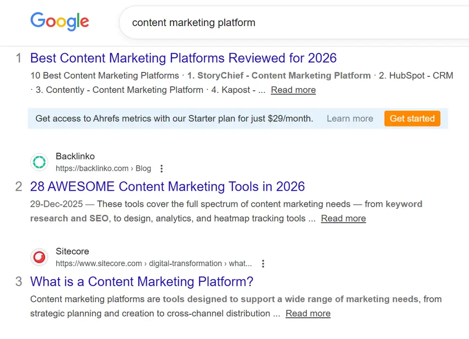 Well, there are two common methods to determine the search intent of a keyword. One is using a search engine. Open Google or another search engine and search for your keyword. For example, searching for “content marketing platform” shows both listicles and guides. So this keyword has both commercial and informational intent.
