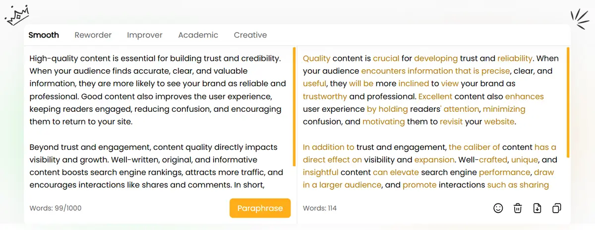 Read the sentences aloud and see where the flow breaks. Rephrase that part to improve it. You can also get help from a paraphrase tool. It can quickly rephrase your text by simplifying the wording and improving the flow to enhance readability. Here is an example of text paraphrased by the tool: