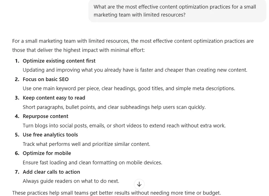 AI prompt: “What are the most effective content optimization practices for a small marketing team with limited resources?”