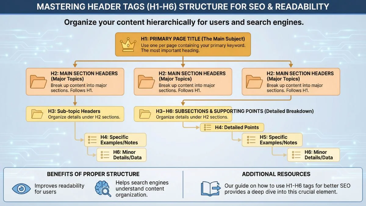 Proper header structure improves readability and helps search engines understand content organization. Our guide on how to use H1-H6 tags for better SEO provides a deep dive into this crucial element.
