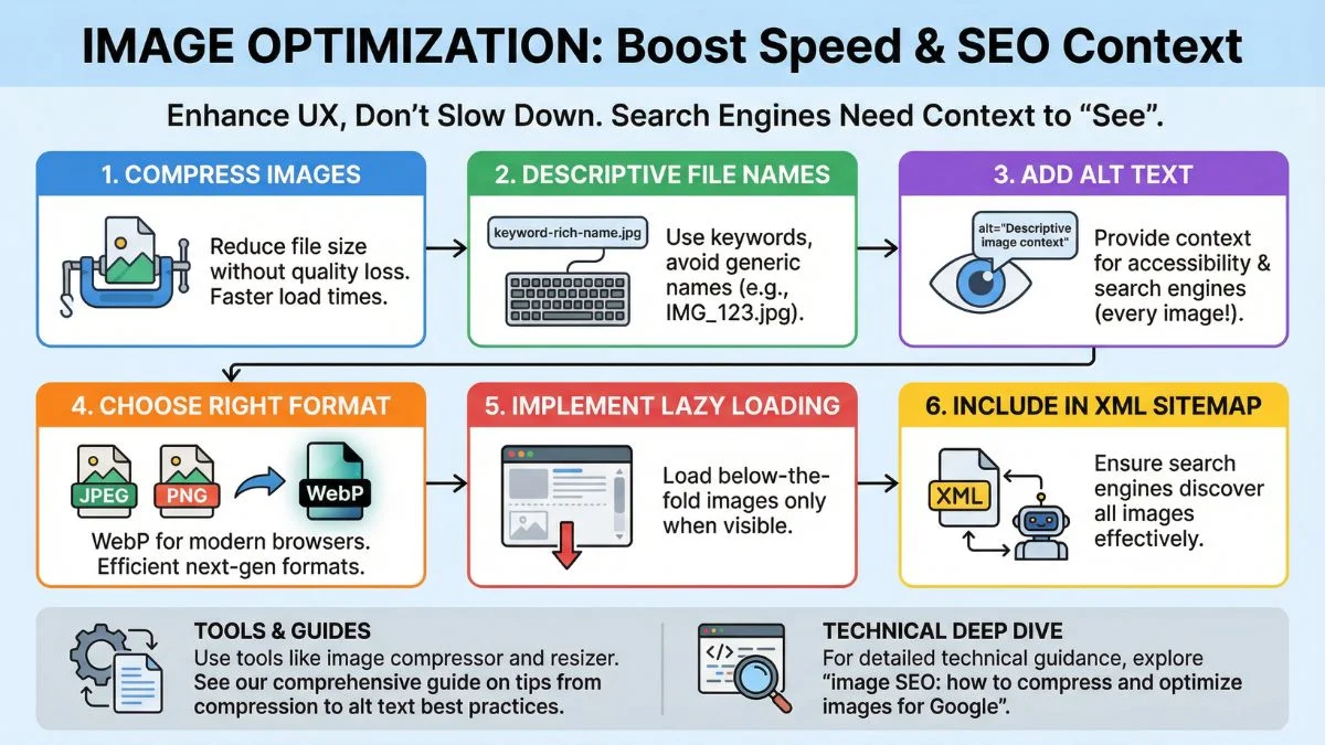 For detailed technical guidance, explore image SEO: how to compress and optimize images for Google.