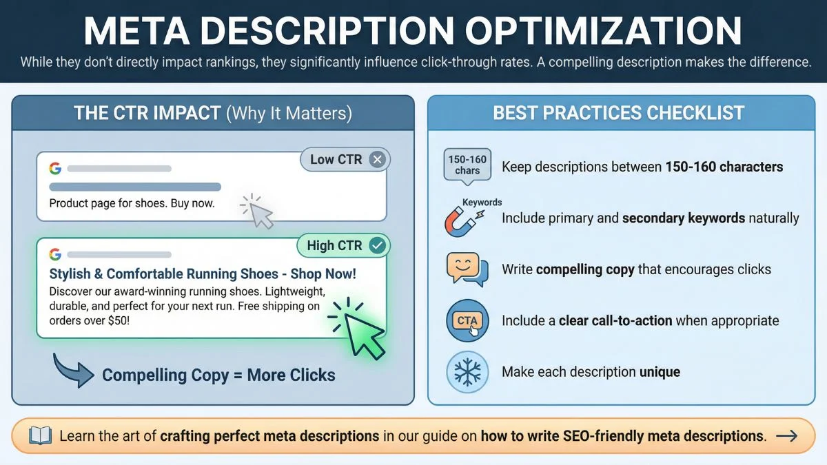 While meta descriptions don't directly impact rankings, they significantly influence click-through rates. A compelling meta description can make the difference between a user clicking your result or your competitor's.