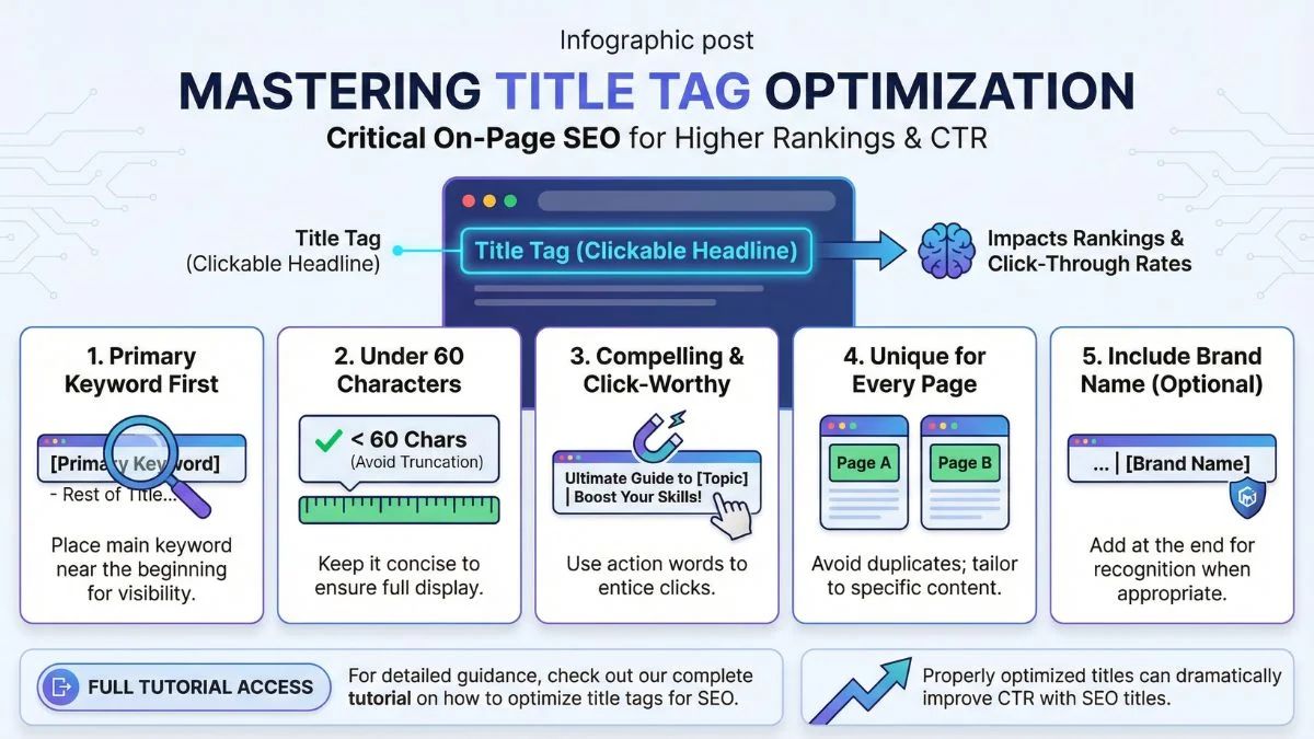 The title tag is one of the most critical on-page SEO elements. It appears in search results as the clickable headline and significantly impacts both rankings and click-through rates.