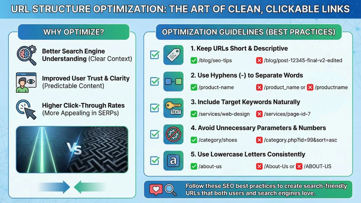 Clean, descriptive URLs help search engines and users understand what a page is about before even visiting it. Well-structured URLs also earn higher click-through rates in search results.